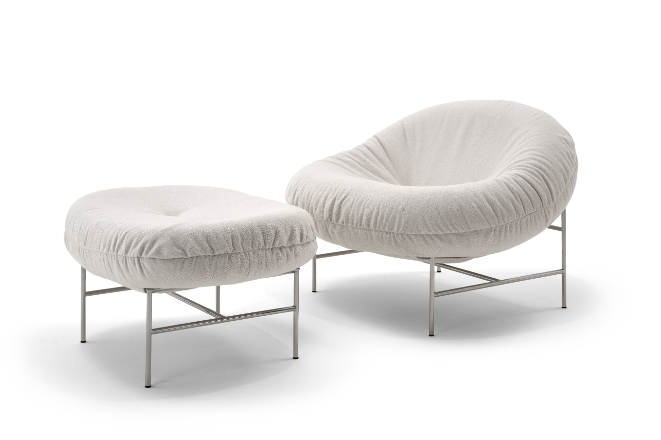 With a thick cushion supported by a slim frame, the Perron Bun Lounge Chair plays with the juxtaposition of heavy and light. Like an inviting nest, the pleasing roundness of the mattress-like cushion is visually and physically comfortable. The curves of the sling base hold the sitter in a comfortable, reclined position, while the discreet stilt legs virtually disappear to make the cloud-like seat appear to float in space. It is available with or without an ottoman.
